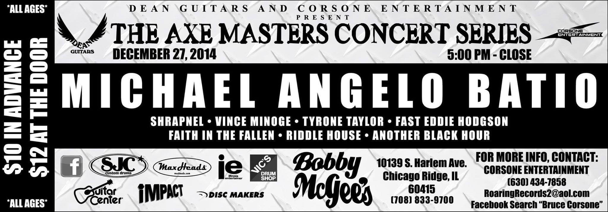Come on out and forget about all the ties, sweaters and other bad Christmas gifts you received by rocking it with Faith In The Fallen and several other bands and solo acts as we support guitar shred legend Michael Angelo Batio. Contact one of us for tickets. See you there! Oh, and leave your new Chia pet at home.